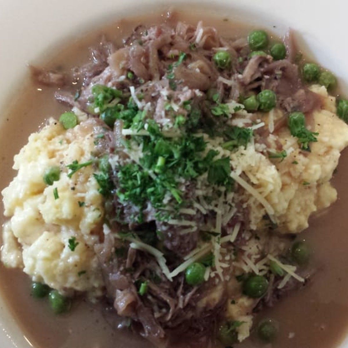 ~ polenta con maiale slow roasted pork with caramelized onions and peas, served on parmesan polenta in a fresh sage chianti butter sauce 30 gf